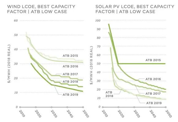 圖為美國國家可再生能源實驗室的年度技術基準(ATB)對未來風能和太陽能的成本預測。從圖中可以看出,風能和太陽能發(fā)電的成本下降速度一直都過預期。 “技術發(fā)展的速度通常被低估了,”加州大學伯克利分校的能源研究科學家AmolPhadke說,“在我的職業(yè)生涯中,我所有的預測都是保守的!