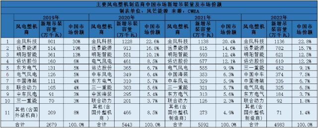 2022年,中國新增吊裝容量前五的風(fēng)電機(jī)組制造企業(yè)是金風(fēng)科技、遠(yuǎn)景能源、明陽智能、運(yùn)達(dá)股份、三一重能,其新增裝機(jī)容量分別為1136萬千瓦、782萬千瓦、621萬千瓦、610萬千瓦、452萬千瓦。