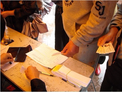 圖為:大明燈業(yè)推廣現(xiàn)場(chǎng)工作前臺(tái)社區(qū)居民持身份證踴躍購(gòu)買(mǎi)大明T5高效照明產(chǎn)品