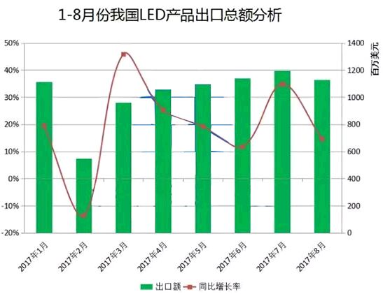 在過去的幾個月,LED市場持續(xù)火熱,金磚會議等國際事件增加了國際貿(mào)易合作與活動,對LED產(chǎn)品的出口有促進(jìn)作用。本期文章將總結(jié)1-8月份LED產(chǎn)品出口情況。 一、出口總額突破80億 據(jù)材料深一度統(tǒng)計(jì),2017年1-8月,我國LED照明產(chǎn)品的出口總額達(dá)82億美元。其中,7月份的出口額是接近12億美元,同比增長34.84%,環(huán)比增長4.89%;8月份的出口額超過11億美元,同比增長14.68%,環(huán)比下降5.68%,由下圖可以看出,3月份到7月份的出口額增速緩慢,而8月份較7月份的出口額小幅回落。