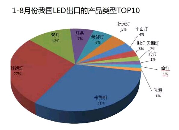 我國LED照明產(chǎn)品出口的目標(biāo)市場超過220個,其中,美國市場占比最高,占我國前8月LED照明產(chǎn)品出口額的26.25%,突破21億美元;香港居其次,超過5.5億美元;德國、英國、法國、日本、巴西、加拿大、俄羅斯及西班牙皆是重要目標(biāo)市場,前8月份均超過2億美元。 二、LED球燈泡出口依然第一 從產(chǎn)品類型來看,LED球泡燈(未列明燈具除外)依然占據(jù)出口的最大比重,約占27%,之后分別是燈管(12%)、燈條(7%)、裝飾燈(6%)和投光燈(5%)。其中,LED球泡燈的主要出口目的地是美國、巴西及加拿大,燈管的主要出口目的地是美國、日本及巴西,燈條的主要出口目的地是美國、德國及香港,投光燈和裝飾燈的主要出口目的地是美國、德國及英國。