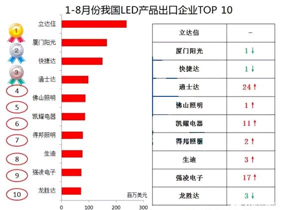 1、漳州立達(dá)信光電子科技有限公司 漳州立達(dá)信光電子科技有限公司于2015年成立。公司經(jīng)營范圍包括研發(fā)、設(shè)計(jì)、生產(chǎn)與銷售:LED燈、節(jié)能燈等。 出口LED產(chǎn)品類型:球泡燈、射燈及筒燈 主要出口市場:美國、法國及英國 2、廈門陽光恩耐照明有限公司 廈門陽光恩耐照明有限公司于2008年成立。公司經(jīng)營范圍包括節(jié)能電光源、LED照明產(chǎn)品制造、照明電器及儀器設(shè)備制造等。 出口LED產(chǎn)品類型:球泡燈、管燈及節(jié)能燈 主要出口市場:美國、波蘭及法國 3、快捷達(dá)通信設(shè)備(東莞)有限公司 快捷達(dá)通信設(shè)備(東莞)有限公司成立于2001年,公司經(jīng)營范圍包括生產(chǎn)和銷售LED照明燈飾等。 出口LED產(chǎn)品類型:管燈 主要出口市場:美國、波蘭及加拿大 4、廈門通士達(dá)照明有限公司 廈門通士達(dá)有限公司成立于1997年5月,現(xiàn)系廈門輕工集團(tuán)有限公司獨(dú)資的國有企業(yè)。主要從事節(jié)能型電光源產(chǎn)品、照明電器、塑膠制品的研究、開發(fā)、生產(chǎn)和經(jīng)營。 出口LED產(chǎn)品類型 :未列明燈具 主要出口市場:美國、匈牙利及巴西 5、佛山電器照明股份有限公司 佛山電器照明股份有限公司是1958年成立的全民所有制國營企業(yè),1992年改組為佛山市第一家股份制試點(diǎn)企業(yè)。佛山電器燈飾所涵蓋的燈飾分類包括吊燈,臺燈,吸頂燈,壁燈,LED燈,幾乎囊括了所有的燈種。 出口LED產(chǎn)品類型:球泡燈、管燈 主要出口市場:美國、加拿大及英國 6、寧波凱耀電器制造有限公司 寧波凱耀電器制造有限公司于2003年成立。公司經(jīng)營范圍包括一般經(jīng)營項(xiàng)目:LED照明器具及其他照明產(chǎn)品等。 出口LED產(chǎn)品類型:球泡燈、筒燈及平面燈 主要出口市場:巴西、法國及西班牙 7、橫店集團(tuán)得邦照明股份有限公司 橫店集團(tuán)得邦照明股份有限公司成立于1996年,主營光源、室內(nèi)燈具、專業(yè)燈具、照明控制和工程塑料五大系列產(chǎn)品的研究開發(fā)、生產(chǎn)制造和國內(nèi)外銷售。 出口LED產(chǎn)品類型:球泡燈 主要出口市場:美國、加拿大及日本 8、生迪光電科技股份有限公司 生迪光電科技股份有限公司于2000年,公司經(jīng)營范圍包括照明電器、電光源器件、燈飾配件的生產(chǎn)、銷售等。 出口LED產(chǎn)品類型:球泡燈 主要出口市場:美國、波蘭及法國 9、上海強(qiáng)凌電子有限公司 上海強(qiáng)凌電子有限公司于1995年成立,主要生產(chǎn)LED燈具和節(jié)能燈,生產(chǎn)研發(fā)一體式。 出口LED產(chǎn)品類型:球泡燈 主要出口市場:美國、日本及西班牙 10、廈門龍勝達(dá)照明電器有限公司 廈門龍勝達(dá)照明電器有限公司于2002成立。公司經(jīng)營范圍包括從事超高亮度發(fā)光二極管以及應(yīng)用產(chǎn)品、電子鎮(zhèn)流器等。 出口LED產(chǎn)品類型:球泡燈、管燈及射燈 主要出口市場:美國、香港及加拿大