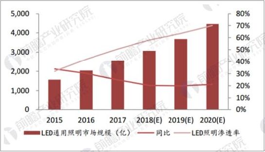 中國LED照明市場規(guī)模、同比增速及滲透率預(yù)測