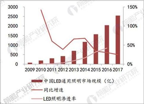 LED照明即是發(fā)光二極管照明,是一種半導(dǎo)體固體發(fā)光器件。它是利用固體半導(dǎo)體芯片作為發(fā)光材料,在半導(dǎo)體中通過載流子發(fā)生復(fù)合放出過剩的能量而引起光子發(fā)射,直接發(fā)出紅、黃、藍、綠色的光,在此基礎(chǔ)上,利用三基色原理,添加熒光粉,可以發(fā)出任意顏色的光。 全球LED行業(yè)方興未艾,智能照明大勢所趨 基于LED光源與傳統(tǒng)光源相比發(fā)光效率高、易受控制、使用壽命長、污染低等特性,近年來照明行業(yè)正處在革命性更新?lián)Q代時代。2009-2015年間,全球LED照明滲透率增速不減,由1.5%穩(wěn)步增長至27.2%,趨勢仍將繼續(xù)。2016年,全球LED照明市場規(guī)模已達346億美元,同增15.80%,市場增速居高不下,有望繼續(xù)保持強勁增長趨勢。 中國LED滲率不斷提升,驅(qū)動市場高速發(fā)展 據(jù)前瞻產(chǎn)業(yè)研究院發(fā)布的《LED照明產(chǎn)業(yè)市場前瞻與投資戰(zhàn)略規(guī)劃分析報告》數(shù)據(jù)顯示,中國LED照明行業(yè)規(guī)模從78億元擴張超過2550億元,09-17年CAGR高達54.62%,LED通用照明市場的快速擴張,主因是通用照明行業(yè)的擴張與LED照明滲透率的提升,LED照明滲透率由2010年的0.6%升至2016年的42%。我們認(rèn)為受益于LED燈的政策扶持和節(jié)能需求提升,LED對傳統(tǒng)燈源的替代效應(yīng)有望持續(xù)釋放,LED滲透率仍將繼續(xù)提升,推動LED通用照明行業(yè)保持快速增長。