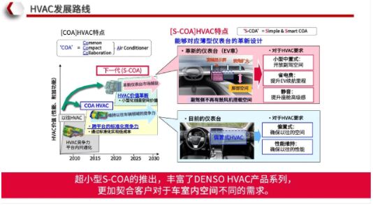 隨著電動(dòng)化浪潮席卷汽車行業(yè),電動(dòng)汽車日益普及,革新的儀表臺(tái)對(duì)HVAC提出了新要求,即小型中置式以開放副駕空間,靜音以提升座艙高級(jí)感,省電以提升電動(dòng)汽車的續(xù)航里程;诖,電裝對(duì)COA HVAC進(jìn)一步升級(jí),推出更與時(shí)俱進(jìn)的S-COA HVAC。