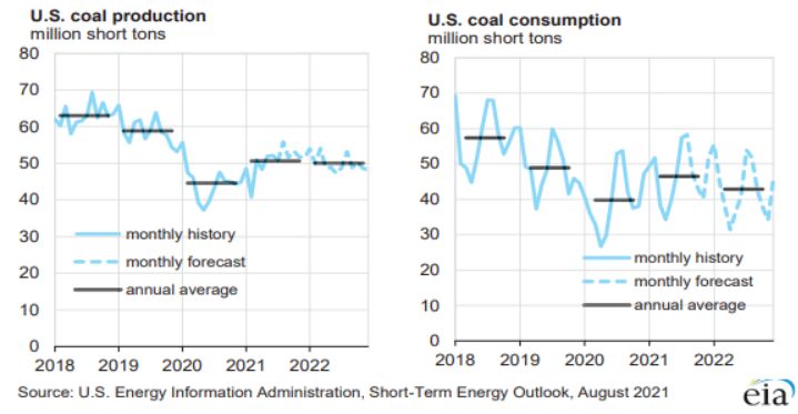 |   8月10日,美國能源信息署(EIA)發(fā)布最新《短期能源展望》報告顯示,2021年,美國煤炭產(chǎn)量預(yù)計為6.07億短噸(5.5億噸),同比增長13%,較前一月預(yù)期值減少1000萬短噸。  報告顯示,2022年,美國煤炭產(chǎn)量預(yù)計為6億短噸,較2021年預(yù)期值下降1.15%。